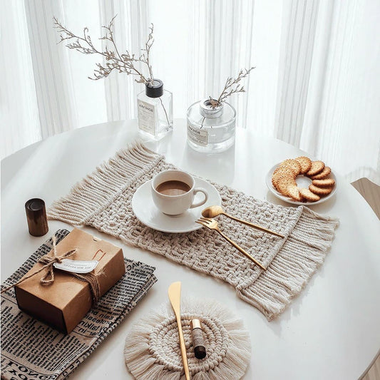 Les chemins de table en macramé transforment instantanément l'ambiance de vos repas. Leurs motifs délicats et leurs franges élégantes apportent une sophistication naturelle à votre art de table. Ces pièces s'adaptent à toutes les occasions et leur neutralité chromatique s'harmonise avec toutes les vaisselles.